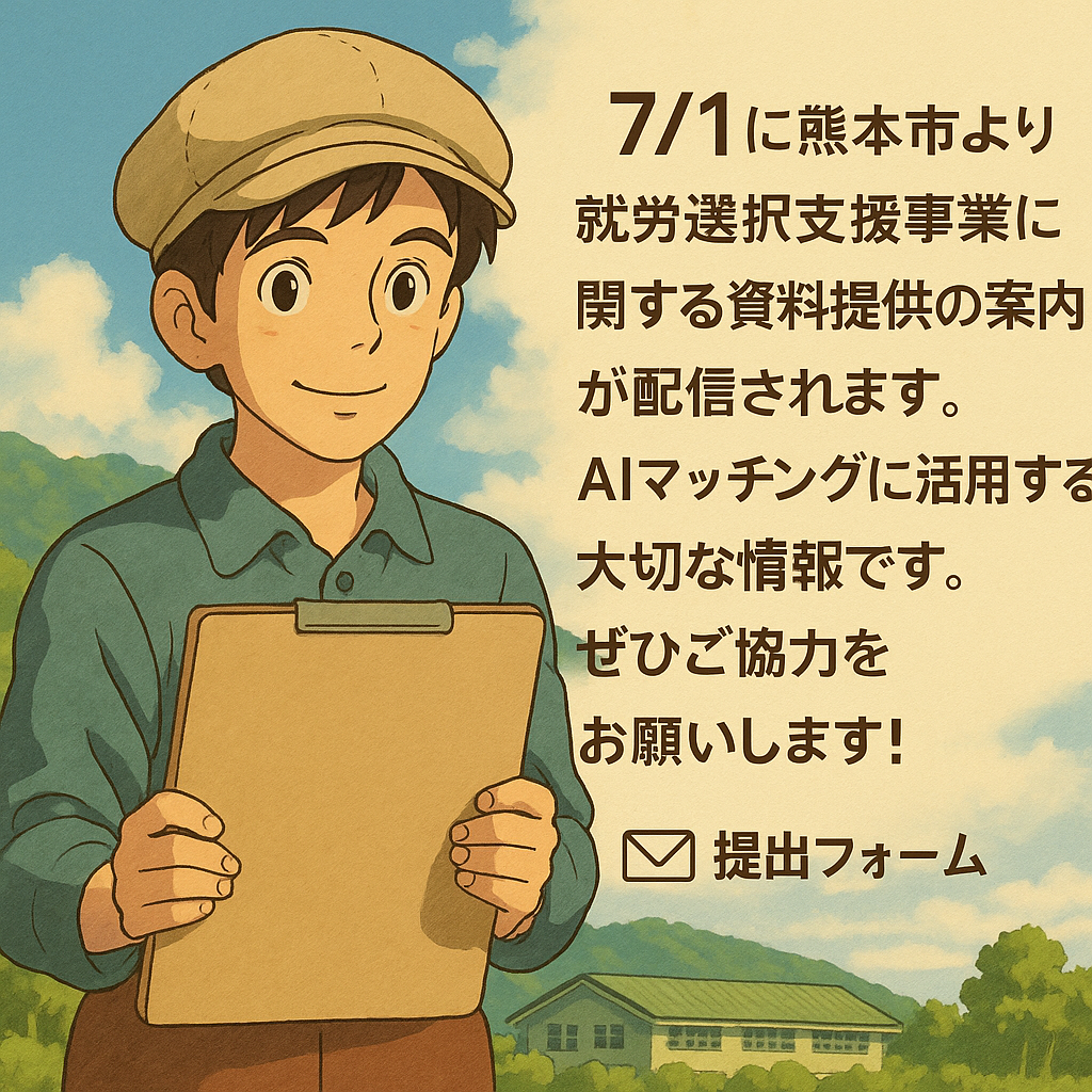 こんにちは。アス・トライ代表の山田です。 いつも熊本市障がい者自立支援協議会の活動にご理解とご協力をいただき、心より感謝申し上げます。 このたび、熊本市より市内の就労系障がい福祉サービス事業所の皆さまへ、「就労選択支援事業」に関するパンフレット等のご提供についてのお願い文書が一斉配信される予定です。 この取り組みは、令和7年10月から始まる「就労選択支援事業」に向けた準備の一環です。