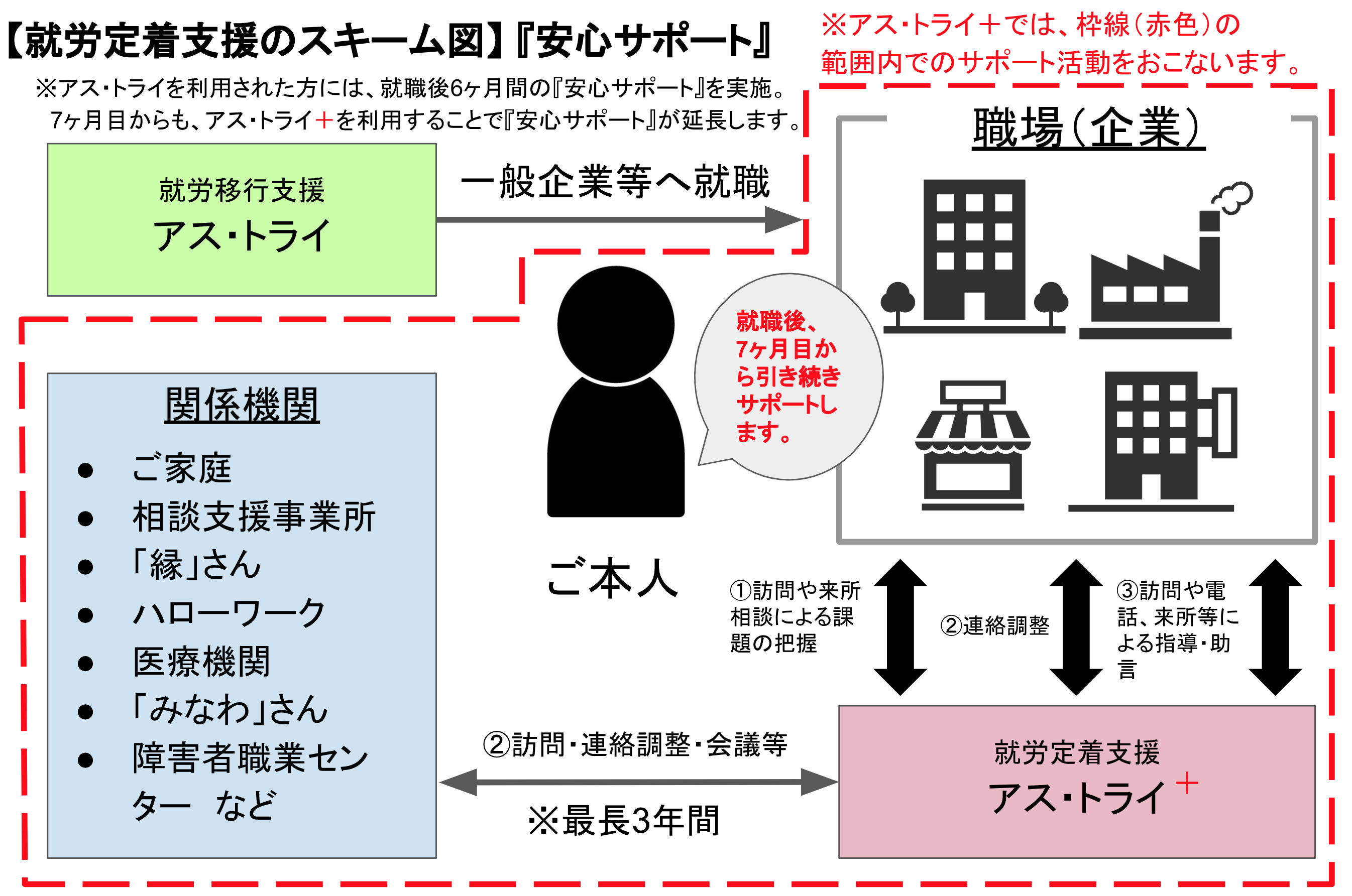 アス・トライなどの障害福祉サービス(就労移行支援,就労継続支援A型など)を利用後、就職から6ヶ月を過ぎた日から『安心サポート』がスタートします。