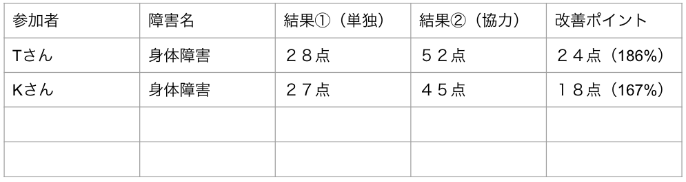 AチームとBチームの向上率に差が出たのは、単純に発言数の違いと仮定し、ピースの置き方について多くの知恵や工夫が集まったとすれば、Aチーム48回、Bチーム21回(7分間での比較)の差は大きいと思われる。Aチームの方がより発言数が多かった(2.3倍)ことで得点率の結果に差が出たのではないかと考える。個人のパフォーマンスが上がることでチーム全体のパフォーマンスも向上したと考える。1回目と2回目の結果の違いは、単なる学習効果と考える節もある。これについては、今後、同一人物による実施回数の積み重ねる中で、どのように変化があるか見守る必要があるだろう。
