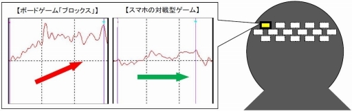 さらに、ゲーム開始時からゲーム終了時までの脳血流量の変化について分析したところ、スマホの対戦型ゲームで遊んでいる際の脳血流の動きに比べ、ボードゲーム「ブロックス」で遊んでいる時の脳血流の方が、ゲーム中盤から終了直前にかけて脳の働きが、右肩上がりで活性化されていること明らかになりました。